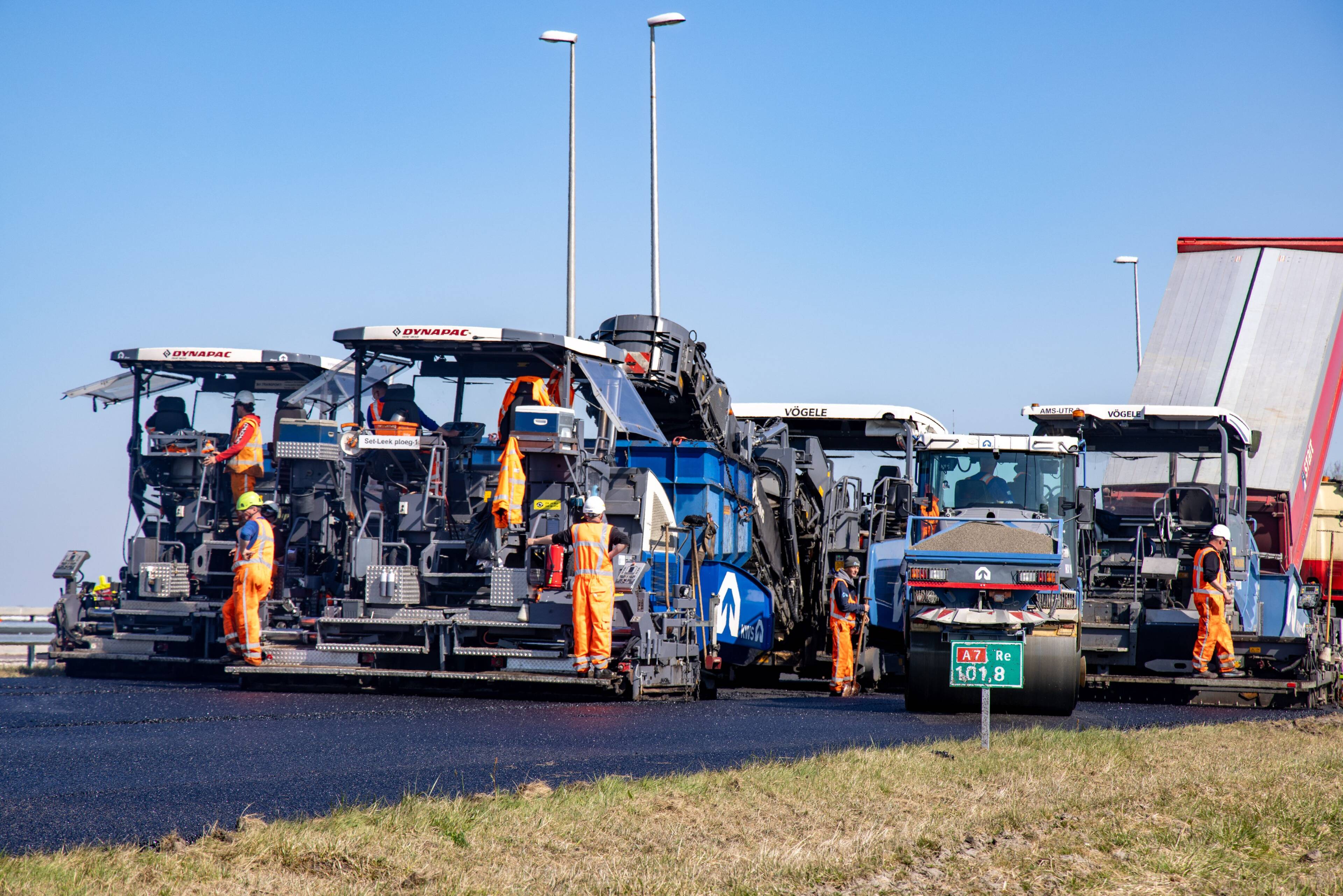 Het werk aan de A7 is onderdeel van groot onderhoud aan verschillende snelwegen in Noord-Nederland. In totaal gaat bij de A7 om 34 kilometer snelweg, verdeeld over zes delen. ‘Twee daarvan voeren we uit in het weekend. Dan heb je even geen verkeer en moet je op de tijd letten,’ zegt Cees. Hij draait al 46 jaar mee bij KWS en weet hoe bepalend die eerste uren zijn. ‘Als je op vrijdagavond al vertraging oploopt, dan heb je het hele weekend een probleem.’ Wouter knikt: ‘Op zo’n weekenddag zijn we met zo’n tachtig man aan het werk. Er wordt gesloopt, gefreesd, gebouwd. En ondertussen moet het asfalt op tijd komen en het liefst ook op de juiste plek. Het is een ingewikkelde puzzel.’