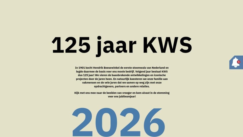 In 1901 kocht Hendrik Boesewinkel de eerste stoomwals van Nederland en legde daarmee de basis voor ons mooie bedrijf. Volgend jaar bestaat KWS dus 125 jaar! We vieren de baanbrekende ontwikkelingen en iconische projecten door de jaren heen. En natuurlijk koesteren we onze familie aan vakmensen en de vele jaren dat we samen op weg zijn met onze opdrachtgevers, partners en andere relaties.