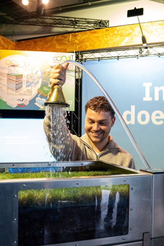 Binnen het project Scale Up Toekomstbestendige Kunstgrasvelden wordt toegewerkt naar een nieuw type sportveld: een klimaatadaptief kunstgrasveld dat verkoelt, water kan opslaan én duurzaam is. Het systeem bestaat uit een slimme onderbak die regenwater opvangt van het veld én omliggende verhardingen. Sensoren sturen pompen die het water millimeternauwkeurig naar een bovenlaag brengen. Een sponsachtige foamlaag verdeelt het water gelijkmatig over de kunstgrasmat. Het resultaat: een koel, comfortabel en veilig speeloppervlak, zelfs tijdens hitte. Het water werkt als een soort ‘stadsairco’ en vermindert hittestress. Bij droogte blijft vocht beschikbaar; bij extreme regenval werkt het systeem als buffer tegen wateroverlast.