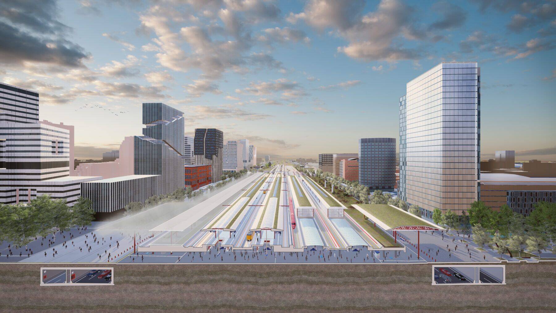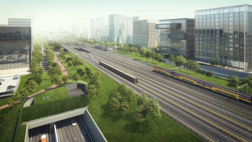 Twee tunnelbuizen van ruim een kilometer lang. Dat klinkt overzichtelijk, maar wie inzoomt ziet hoe complex het is. ‘We zitten nu in de ontwerpfase van dit uitdagende project. Met name de beperkte ruimte waar wij de tunnel moeten bouwen is een uitdaging,’ vertelt Pieter. Als realisatiemanager is hij één van de schakels tussen alle afdelingen. Met een project van deze grootte is dat zeker nodig. ‘De Zuidas is altijd in beweging en ontzettend druk. Ook de snelwegen en het openbaar vervoer eromheen staan nooit stil. Je zit met elkaar op een postzegel.’ En juist op die postzegel wordt vanaf 2027 een deel van de A10 ondergronds gebracht. Boven de tunnels ontstaat 100.000 m2 ruimte voor de uitbreiding van station Amsterdam Zuid met internationaal treinverkeer, betere aansluitingen op bus, tram en metro en een aantrekkelijke openbare ruimte. Tegelijkertijd wordt de snelweg verbreed met twee extra rijstroken in elke richting, zodat doorgaand verkeer en bestemmingsverkeer beter van elkaar worden gescheiden.
